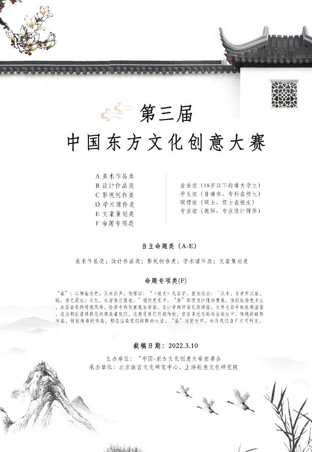 (1)學術論文:關于中國傳統文化、非遺文化、文化創意、美學等領域的學術論文,論文主體字數不少于2000字,結構及論文要素完整。如已經發表,需附帶刊物的封面封底、目錄及正文的掃描文件。