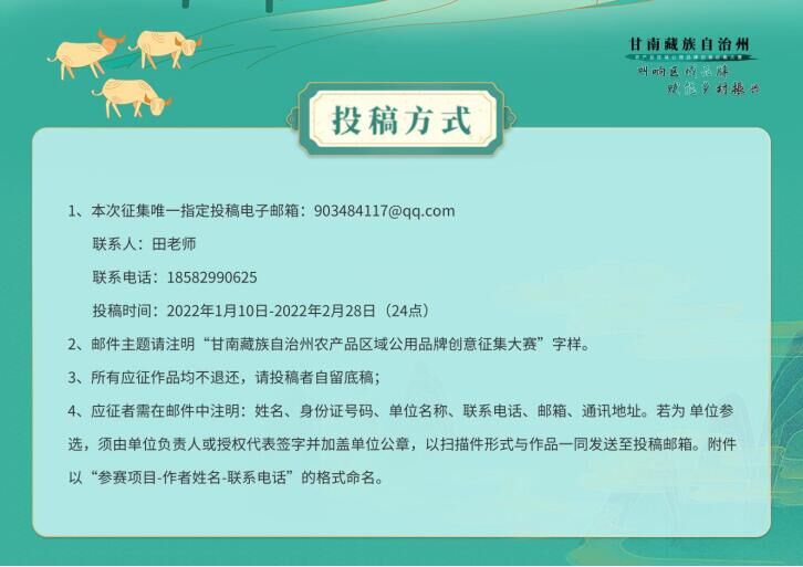 2.郵件主題請注明“甘南藏族自治州農(nóng)產(chǎn)品區(qū)域公用品牌創(chuàng)意征集大賽”字樣。應(yīng)征者需在郵件中注明:姓名、身份證號碼、單位名稱、聯(lián)系電話、郵箱、通訊地址。若為單位參選,須由單位負(fù)責(zé)人或授權(quán)代表簽字并加蓋單位公章,以掃描件形式與作品一同發(fā)送至投稿郵箱。附件以“參賽項目-作者姓名-聯(lián)系電話”的格式命名。