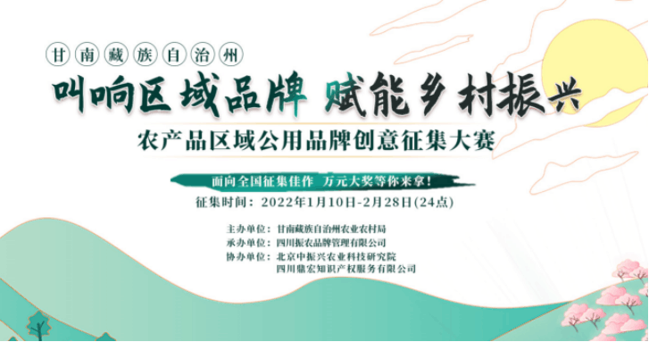 2022年1月10日,由甘南藏族自治州農(nóng)業(yè)農(nóng)村局主辦、四川振農(nóng)品牌管理有限公司承辦、北京中振興農(nóng)業(yè)科技研究院及四川鼎宏知識產(chǎn)權(quán)服務(wù)有限公司共同協(xié)辦的甘南藏族自治州農(nóng)產(chǎn)品區(qū)域公用品牌創(chuàng)意征集大賽正式啟動。旨在深入加快甘南州農(nóng)產(chǎn)品區(qū)域公共品牌建設(shè),樹立品牌形象、講好品牌故事,推動甘南農(nóng)業(yè)高質(zhì)量發(fā)展。