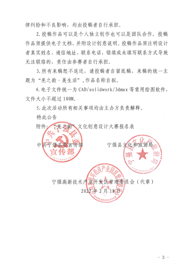 為深入貫徹習近平新時代中國特色社會主義思想,推動文化創意和設計服務與相關產業融合發展,為人民群眾提供高品質的各類設計產品和美好生活體驗,中共寧強縣委宣傳部、寧強縣文化和旅游局、寧強高新技術產業開發區管委會共同發起舉辦2022年“羌之韻”文化創意設計大賽。現將有關事項公告如下: