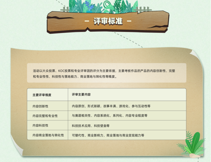 活動以大眾評選、KOC評分和專家導師評審團評分為主要依據,主要考核參選作品的創新性、完整和專業性、科技性、商業落地與轉化性等維度。