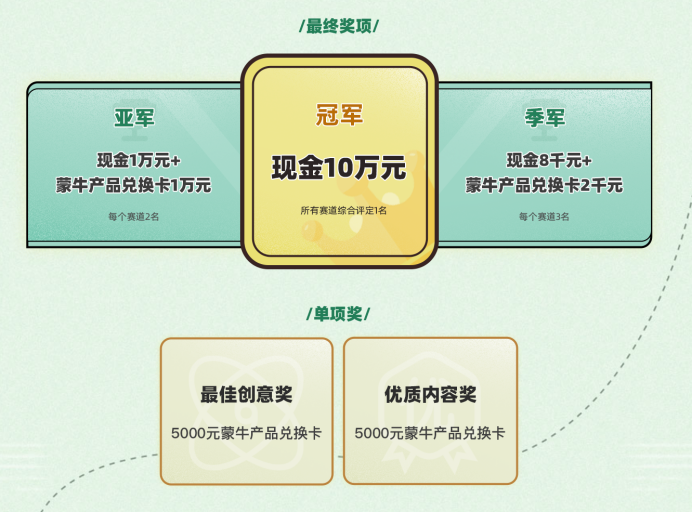 獲獎者最高可獲得10萬元獎金,參賽優秀者將有機會獲得蒙牛及蒙牛生態企業的業務訂單,提供蒙牛的落地場景機會,有機會進入蒙牛生態,對接大企業產業資源,甚至獲得蒙牛創投基金及產業內知名機構的投資。