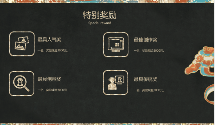 另設置四項特別獎勵:最具人氣獎、最佳創(chuàng)作獎、最具創(chuàng)意獎、最佳傳統(tǒng)獎(每項獎勵現(xiàn)金3000元)