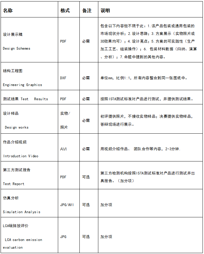 提交要求:答辯文件命名選手編號-姓名/指導(dǎo)教師-大賽決賽作品。樣品郵寄時需要明顯標(biāo)記打包好的包裹,標(biāo)記要顯示“運(yùn)輸包裝設(shè)計(jì)大賽”字樣,且需內(nèi)附一張A4紙注明選手編號和選手姓名。