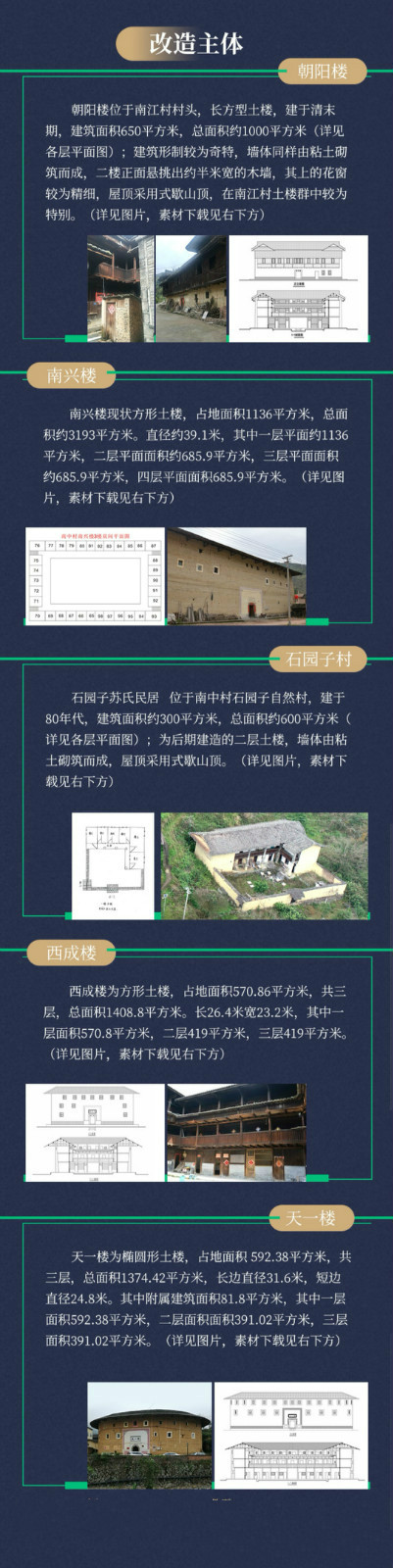 (1)任選一棟土樓為改造主體,設計需保留原有房屋主體構造,通過外立面改造、室內設計、周邊環境的營造,將土樓原有文化基因以不同風格的改造設計凸顯出來。