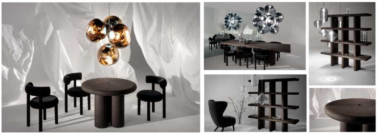 Cork家具系列是一個包括桌子、椅子、置物架的系統,由Tom Dixon品牌創意總監及宜家設計師Tom Dixon設計,為斯堪的納維亞美學風格,采用環保的軟木和聚氨酯樹脂以93:7的比例作為材料,燒焦的家具具有深棕色色彩,圓潤的輪廓設計突顯了材料的光澤,對親子家庭十分友好。有趣的是,當密度達到一個標準后,軟木桌子在硬度上不比實木遜色,且肌理和質感比混凝土或玻璃更具溫暖及柔和感,這一耐用、吸音、防火、防水的彈性材質更受酒店和餐廳的設計所青睞。