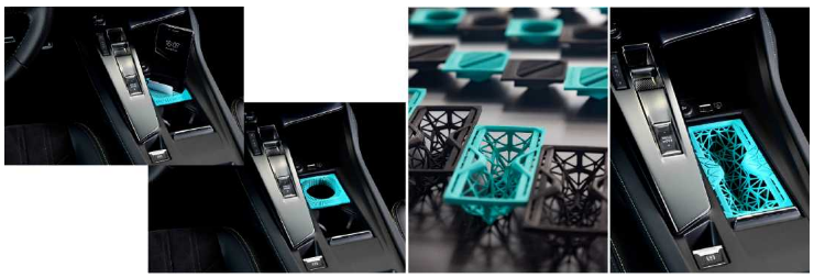 Peugeot新款308汽車是3008SUV的迭代版,其創新的內飾儲物槽為3D打印,采用熱塑性聚氨酯彈性體(TPU)作為材料,具有橡膠一般的彈性和塑料一般的耐久性。這款定制的儲物槽具有不同的功能,比如作為手機支架、太陽鏡盒子、杯子支架等。設計的合作方還包括HP Inc.、M?der、ERPRO、BASF。