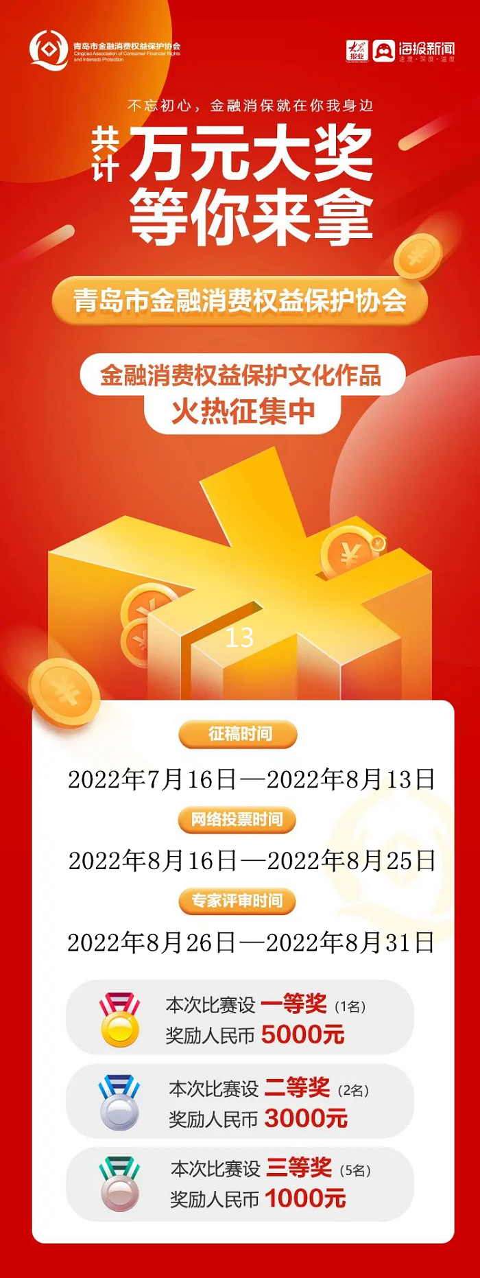為加大金融消費權益保護知識的宣傳普及力度,激發市民金融知識學習熱情,提升市民金融素養,提高島城家庭的金融消保知識水平,推進普惠金融高質量發展,青島市金融消費權益保護協會將舉辦第四屆“金消協杯”金融消保知識進家庭文化作品大賽。