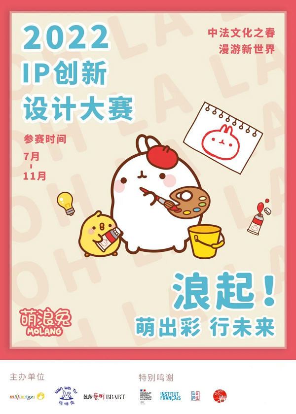 本次大賽以法國動漫“萌浪兔”中的主要角色“萌浪”、“PiuPiu”及動畫片中相關主題素材作為創作模板素材,以“陪伴”為創作主題,可結合但不限于傳統中國元素、國風、潮流等風格進行創作,且藝術表現形式不限