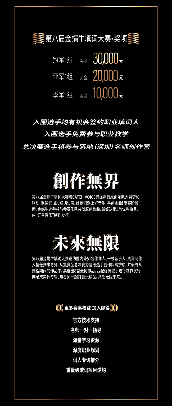 3、參與第八屆金蝸牛填詞大賽的作品,在比賽期間直至大賽結束后90天內,作品不得以任何形式發布到其他任何網絡音樂平臺,大賽主辦方保留此期間內所有參賽作品的相應版權及各項權益。