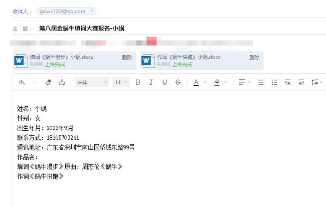 ① 郵件標題:“第八屆金蝸牛填詞大賽報名-作者名”