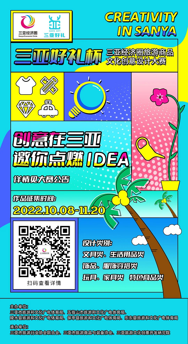 為進(jìn)一步擴(kuò)大三亞經(jīng)濟(jì)圈旅游產(chǎn)業(yè)集群的輻射和影響作用,結(jié)合海南自貿(mào)港“打造國(guó)際設(shè)計(jì)島”建設(shè)要求,以整合三亞經(jīng)濟(jì)圈各市縣旅游文化資源、開(kāi)發(fā)旅游文化商品、促進(jìn)區(qū)域旅游合作及經(jīng)濟(jì)增長(zhǎng)為目的,三亞市、五指山市、陵水縣、保亭縣、樂(lè)東縣旅游和文化廣電體育局將舉辦2022首屆“三亞好禮杯”三亞經(jīng)濟(jì)圈旅游文化商品創(chuàng)意設(shè)計(jì)大賽。現(xiàn)面向社會(huì)廣泛征集和評(píng)選具有三亞經(jīng)濟(jì)圈特色的旅游文化創(chuàng)意商品。