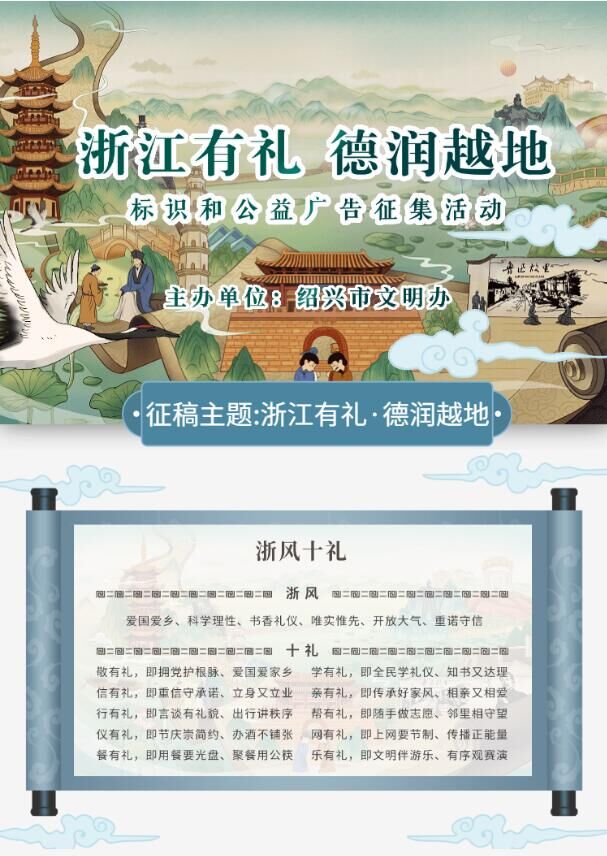 1、圍繞“浙江有禮·德潤越地”主題,以“浙風十禮”為元素進行創作,體現紹興辨識度。視頻數量為1個,作品要求積極、健康、向上、并且有創意。