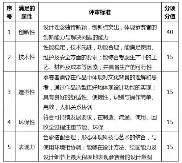1、參賽作品須符合國家產業政策及有關技術、標準等規定,符合低碳、綠色、環保設計理念,在功能、結構、技術、形態、材料、工藝、節能、環保等方面有較大創新。