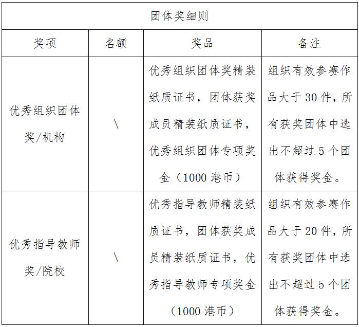 本次大賽設置作品獎和團體獎,作品獎以個人為單位報名,通過個人賽道評比。團體獎由指導教師或者團體帶頭人以團體為單位提交,通過團體賽道評比。作者本人只能選擇其中一個賽道參加。如有獲獎,個人賽道和團體賽道獲獎者榮譽不疊加。