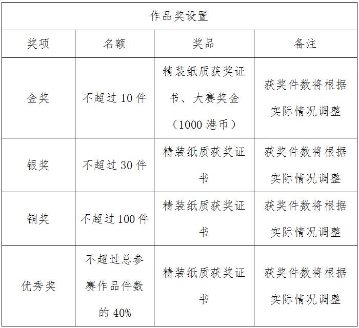 藝術作品需繳納參賽費100港幣/件(大陸參賽92元/件),多件作品疊加收費,系列作品按一件作品收費,參賽費將用于評審、獎金發放、證書制作、快遞等費用,未獲獎者不予退費。