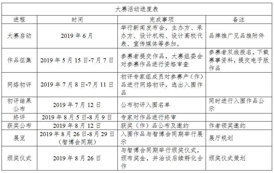 (一)大賽分為啟動、征集、評獎、展覽、孵化五個部分。