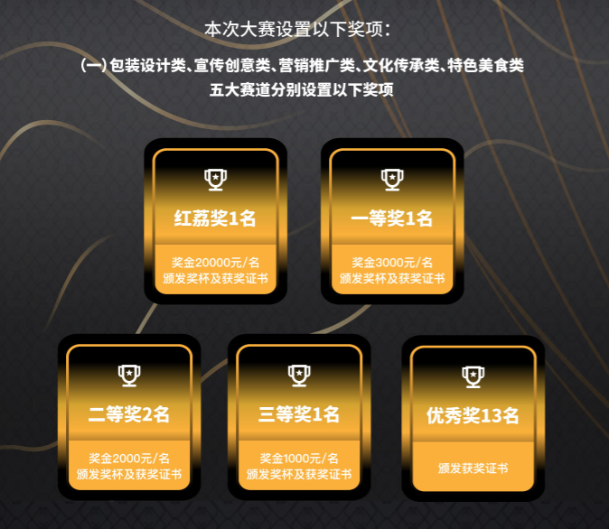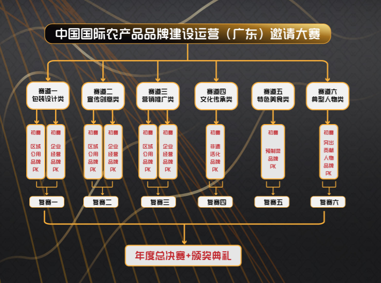 本次大賽設(shè)置包裝設(shè)計(jì)類(lèi)、宣傳創(chuàng)意類(lèi)、營(yíng)銷(xiāo)推廣類(lèi)、文化傳承類(lèi)、特色美食類(lèi)及典型人物類(lèi)六大賽道,九場(chǎng)初賽,六場(chǎng)復(fù)賽,一場(chǎng)年度總決賽及頒獎(jiǎng)典禮。