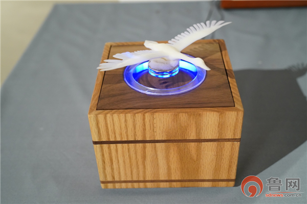 嘉賓們或不時駐足觀賞,或依次細細打量,或零距離體驗高科技的衍生品,大天鵝獨有的魅力深深吸引了眾人。一件名為《獨舞凌波》的絲綿畫作品做吸引了現(xiàn)場觀眾的目光,作品中,一只大天鵝游憩在水中,精心選用的絲綿材質(zhì)賦予了天鵝白羽生動的立體感,展現(xiàn)了大天鵝的優(yōu)雅,讓人禁不住想撫摸一下栩栩如生的海邊仙子。利用磁懸浮技術(shù)理念的《天鵝夜燈》前也聚集了很多觀眾,小夜燈利用磁鐵同性相斥的特點將天鵝懸浮在空中,展現(xiàn)著大天鵝自由不被束縛的。“今天看了很多跟大天鵝有關(guān)的創(chuàng)意作品,除了常見的茶具、燈具、剪紙之外,還有音響、曲別針、衣架、飛行棋等形式。真沒想到,榮成的老朋友大天鵝可以有這兒多千姿百態(tài)的展現(xiàn)形式。真是開眼界了!”現(xiàn)場觀眾不禁贊嘆!