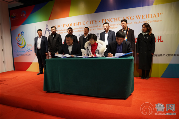 活動現(xiàn)場,歌爾集團、榮成好運角文化旅游有限公司與威海金鑲玉工藝品有限公司負責(zé)人簽訂文創(chuàng)產(chǎn)品開發(fā)合作框架協(xié)議。