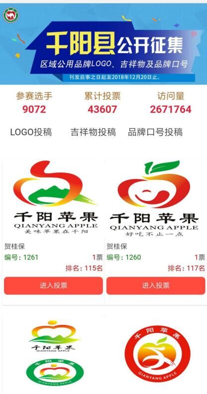 為深入貫徹落實中央鄉(xiāng)村振興戰(zhàn)略,創(chuàng)建千陽蘋果區(qū)域公用品牌,進(jìn)一步提升千陽縣農(nóng)產(chǎn)品品牌形象和核心競爭力,充分發(fā)揮品牌引領(lǐng)作用,構(gòu)建千陽縣蘋果品牌形象,提升文化內(nèi)涵,提高千陽縣蘋果產(chǎn)業(yè)的市場影響力和競爭力,打造千陽縣蘋果產(chǎn)業(yè)鏈,2018年11月份由活動組委會向海內(nèi)外公開征集千陽縣區(qū)域公用品牌LOGO、吉祥物及品牌口號,自征集公示發(fā)出之后,收到了各界人士的積極投稿,截止2018年12月18日共計有9064個選手參與投稿,大賽訪問量260萬余次,活動組委會將根據(jù)專家評審意見,確定初選入圍作品后,面向社會進(jìn)行公示,進(jìn)行投票評選。