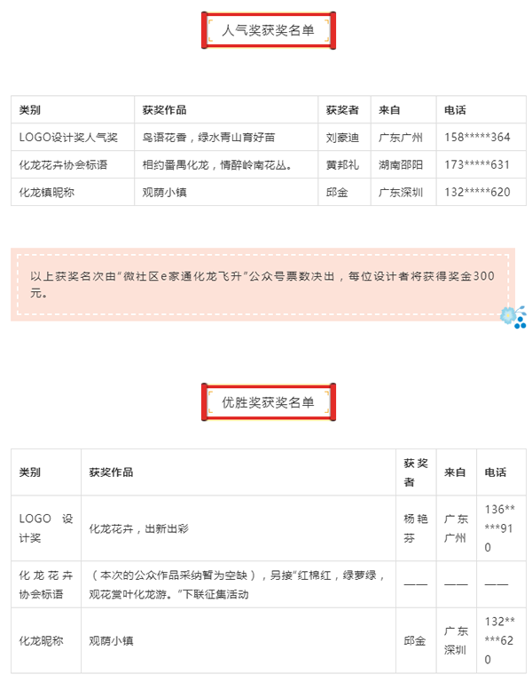 以上獲獎名單由專家組評審舉出,其中logo設計獎獎金3000元,化龍鎮昵稱設計獎獎金2000元,目前化龍花卉協會標語暫空缺,將進行第二輪征集!征標網整理