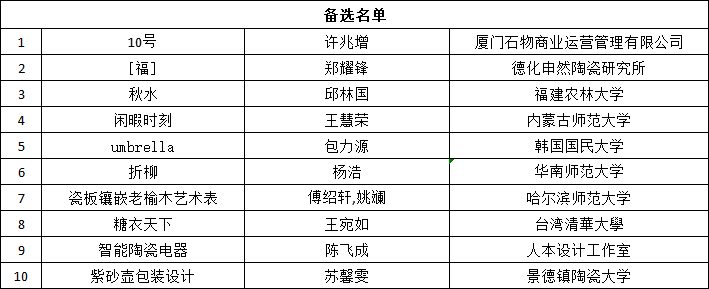 請入圍參賽者(含備選名單)保持郵箱、短信、電話暢通,注意查收由組委會發(fā)放的賽事通知,根據(jù)“何朝宗杯”2019中國(德化)陶瓷工業(yè)設計大賽評審細則,于收到通知即日起寄送實物或作品模型至組委會辦公室,特殊情況可根據(jù)郵件具體要求向組委會說明情況。