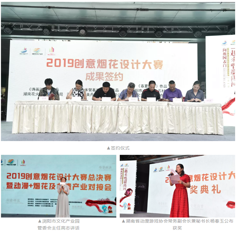 9月22日,由湖南省文化和旅游廳、中共長沙市委宣傳部指導,中共瀏陽市委宣傳部、瀏陽市文化產業園管委會、湖南省動漫游戲協會主辦,湖南漫村文化發展有限公司、湖南花火劇團有限公司承辦,創意煙花·美漫生活2019創意煙花設計大賽總決賽,來到世界煙花之鄉——瀏陽,在“智慧瀏陽河”文化創意孵化基地成功舉辦。大賽旨在推動我省及瀏陽文化產業創新升級,以新理念、新業態、新技術推動湖湘優秀傳統文化創造性轉化、創新性發展,吸聚和培養創意煙花新人才,實現創意成果轉化,資源對接,促進煙花產業與動漫等現代文化產業跨界融合,高質量發展。