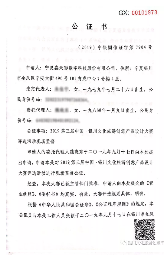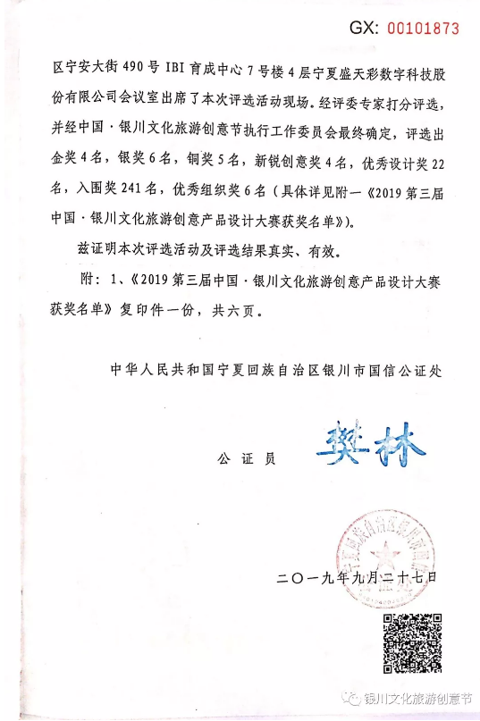本次大賽評選于2019年9月17日在寧夏盛天彩數字科技股份有限公司四樓大賽組委會工作室評選完畢,經5位專家評審、銀川國信公證處人員公證,最終評選結果確認如下: